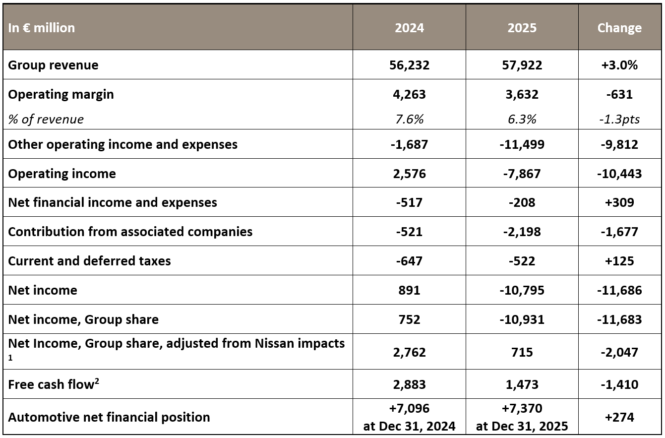 [6] Nissan’s impacts in 2025: -€2,331m of Nissan’s negative contribution in associated companies, -€9,315m loss resulting from the evolution of the accounting treatment for the investment in Nissan recorded in other income and expenses.
